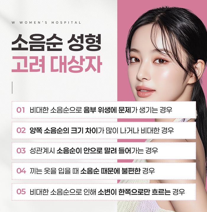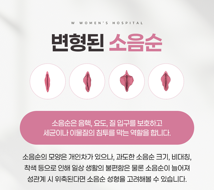 제공자 산부인과 전문의 성의선 원장 ![]() 소음순 변형 단순한 미용 문제가 아닙니다. 안녕하세요. 인천W여성병원 여성성형 중점 W미즈클리닉 입니다. 여성의 외음부는 나이, 호르몬 변화, 출산, 유전적 요인 등으로 다양한 변화를 겪게 됩니다. 그중에서 오늘은 소음순이 비대해지거나 비대칭으로 변형되는 현상에 대해 알아보고.... 이로 인해 나타나는 문제점 그리고 해결 방법을 소개해 드리도록 하겠습니다. 특히, 최근 들어 숭의동 지역 여성들 중에 운동이나 속옷 착용 시 불편감, 위생 문제, 심리적 위축감을 호소하며 병원을 찾는 분들이 점점 늘고 있습니다.