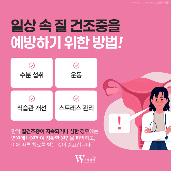 질 건조증을 예방하는 방법은 ▲ 수분 섭취 ▲ 적절한 운동 ▲ 식습관 개선 ▲ 스트레스 관리