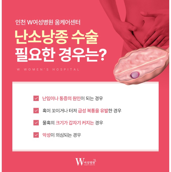 - 난임이나 통증의 원인이 되는 경우 - 혹이 꼬이거나 터져 급성 복통을 유발한 경우 - 물혹의 크기가 갑자기 커지는 경우 - 악성이 의심되는 경우