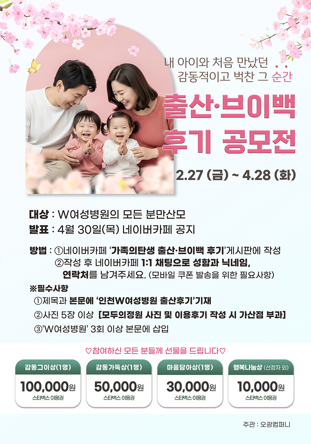 방법 : ①본원 네이버카페 '가족의 탄생 출산·브이백 후기'게시판에 작성
