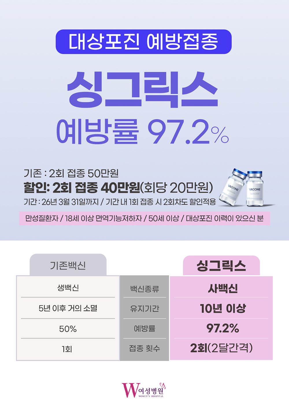 <대상포진 예방> 싱그릭스 접종 할인 이벤트 기간 : ~26년 3월 31일까지 * 기존 : 2회 접종 50만원 * 할인 : 2회 접종 40만원(회당 20만원) *이벤트 기간내 1회 접종시 2회차도 할인 적용 ※ 50세 이상 / 만성질환자 / 18세 이상 면역기능저하자 대상포진 이력이 있으신 분 W여성병원에서 대상포진 예방접종으로 미리 관리하시기 바랍니다. |