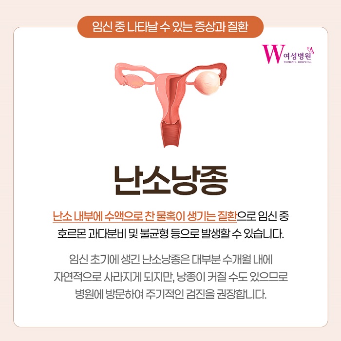 *착상출혈은 임신 초기에 경험할 수 있는 자연스러운 현상 중 하나입니다. 그렇기 때문에, 착상출혈이 유산을 의미하지는 않습니다. 특히, 임신 초기에는 위와 같은 작은 변화들에 당황할 수 있기 때문에 놀라지 마시고, 주치의와 상의하시는 것이 우선입니다. 임신 중 냉 증가? 실제, 임신을 하게 되면 호르몬 작용으로 인해 '냉'분비가 자연스럽게 증가하게 됩니다. 하지만, 임신 중 속옷이 젖을 만큼 그 양이 많다면, 당연히 걱정이 많으실 수밖에 없습니다. 하지만, 이는 대부분의 임산부들이 경험하는 정상적인 현상 중 하나입니다. 하지만, 냉분비가 많을 때는 색을 체크해야 합니다. 정상 분비물인 경우 무색, 무취지만 질염에 걸린 경우 흰색이나 녹색일 가능성이 높고 갈색이라면, 출혈을 의심해 봐야 하기 때문에 꼭! 병원에 방문해 태아 상태를 확인하고 출혈의 원인을 찾는 것이 우선되어야 합니다. ![]() 임신 중 난소낭종을 발견했다면? 실제로, 임신 과정에서 난소낭종이 발생될 수 있습니다. 그 이유는, 임신으로 인해 호르몬이 급격히 변화하면서 난소에 일시적으로 혹(낭종)이 생길 수 있기 때문입니다. *일반적으로 임산 중에 발견되는 난소낭종은 '기능성 난소낭종'과 '황체 난소낭종'입니다. 이러한 난소낭종은 주로 임신 호르몬의 영향으로 생기기 때문에, 대부분 자연적으로 사라집니다. 그래서 크게 걱정하시진 않아도 되지만 만약, 추적 관찰 결과 낭종의 크기가 커지거나 모양이 좋지 않을 경우 추가적인 치료가 필요할 수 있습니다. ![]() 임신 후 초음파 검사에서 발견된 자궁근종 최근, 연예인의 임신 후 정기검진 과정에서 자궁근종을 발견한 내용이 알려지면서, 관심이 높아지고 있습니다. 우선, 자궁근종이라는 것은 자궁 근육층에 생기는 양성종양입니다. 자궁근종은 35세 이상의 여성의 40~50%에서 발견될 정도로 흔한 부인과 질환이지만 임산부에서 발견될 확률은 약 2% 수준입니다. 만약, 임신 후 정기검진 과정에서 자궁근종이 발견되었다고 해서, 너무 걱정할 필요는 없지만 근종의 크기가 크고 위치가 좋지 않다면 추가적인 치료를 받아야 합니다. ![]() 임신 중 이상 증상이 있다면 절대, 혼자 고민해서는 안 됩니다. 임신과 출산은 여성의 삶에서 중요한 전환점입니다. 그렇기 때문에, 이 시기에 여성 건강을 더 주기적으로 꼼꼼히 체크해야 합니다. 산모들은, 출산까지 항시, 다양한 위험성을 인지하고 주치의를 통한 정기적인 검진과 상담을 통해 건강한 임신과 출산을 준비해야 합니다. 절대, 고민한다고 해서 문제가 해결되는 것은 아니니 시간을 지체하지 마시고, 꼭 주치의를 통한 진료와 필요한 검사를 적극적으로 받으시길 권합니다.