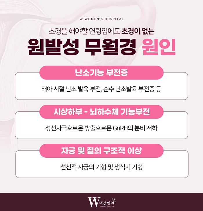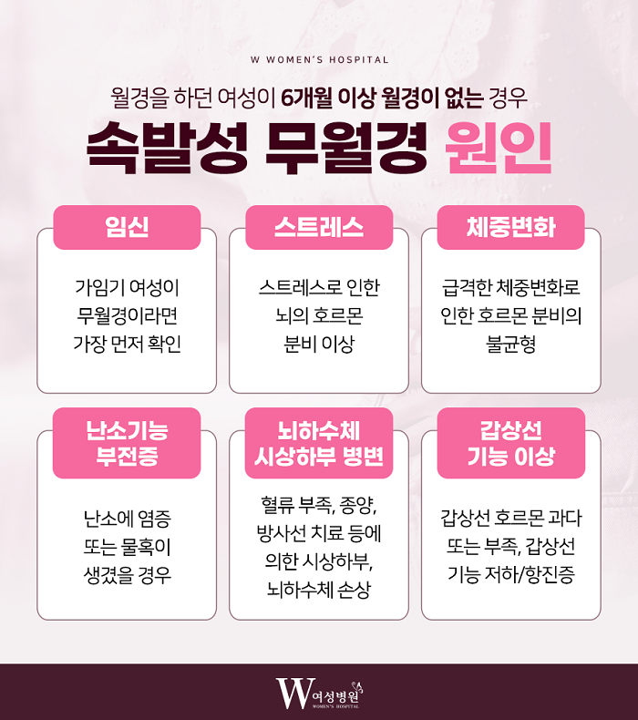 정상적인 월경은, 뇌(시상하부-뇌하수체)-난소로 연결되는 호르몬 분비가 자궁에 작용하여 발생되는 생리적 현상을 이야기합니다. 이 중 어느 하나라도 구조나 기능의 이상이 발생되면 '무월경'이 나타날 수 있습니다. 임신을 이유로 한 '무월경'이 아니라면 각종 자궁 및 난소질환을 의심해 봐야 하기 때문에 정확한 진단을 위한, 산부인과 진료가 필요합니다. ![]() 무월경, 다 같지 않습니다. 진료과 : 산부인과 무월경은, 첫 월경(초경)이 있었는지에 따라 ▲원발성 무월경 ▲속발성 무월경으로 나누어집니다. 원발성무월경이란, 초경이 없는 경우입니다. 속발성무월경은 월경을 하던 여성에게 나타나는 경우입니다. *월경주기는 외부환경 영향을 많이 받기 때문에 한 주기 정도 월경이 없는 것은 큰 문제가 되지 않지만 오랫동안 월경이 없다면, 건강 이상의 첫 징후일 수 있습니다. ![]() 무월경증 종류에 따라 원인이 다릅니다. 무월경증의 원인은 다양합니다. 그렇기 때문에, 반드시 전문의를 통한 정확한 진단 과정에서 원발성과 속발성을 구분하고 그에 따른 원인을 찾는 것이 앞으로의 치료 방향을 계획하는데 있어 매우 중요하기 때문입니다. 1. 원발성 무월경 원인은? *원발성무월경은, 초경을 해야 할 연령임에도 불구하고, 초경이 없는 경우를 이야기합니다. ▲ 난소기능 부전증 ▲ 시상하부 - 뇌하수체 기능부전 ▲ 자궁 및 질의 구조적 이상 ![]() 2. 속발성 무월경 원인은? 속발성무월경 역시, 발생 원인은 다양하지만 보통 (임신 / 수유 / 폐경)이 가장 흔한 원인입니다. 그 밖의 원인은 전체 무월경환자의 3~4% 수준입니다. 이중, 흔한 원인을 찾아보면 ▲다낭성난소증후군 ▲시상하부 이상에 의한 무월경 ▲ 난소기능 부전증 등이 있습니다. 속발성무월경의 경우, 환자분의 병력청취와 검사를 통해 다양한 측면에서 원인을 찾는 것이 중요합니다. ![]() 무월경증 2030에서 급증하는 이유는? 다양한 원인이 있겠지만 2030세대의 무월경증 증가 원인으로 ▲스트레스 ▲다이어트 를 꼽을 수 있습니다. 비교적 젊은 2030대는 시험이나 직장 내 업무 스트레스 잘못된 방식의 극단적 체중 감소를 진행하는 과정에서, 시상하부 장애가 나타날 수 있고, 이로 인해 무월경증 발생 확률이 높아질 수 있기 때문입니다. 무월경증은 여성 건강의 '적신호'입니다. 무월경증은 여성 건강의 적신호입니다. 무월경증으로 인해 호르몬 불균형을 초래하여 다양한 여성질환 발병률을 높일 수 있습니다. 뿐만 아니라 2030세대, 가임기 여성의 경우 임신에 어려움을 겪는 '난임'으로 이어질 수 있기 때문에 반드시, 정기적인 산부인과 검진을 통해 자신의 건강 상태를 확인하는 것이 중요합니다. |