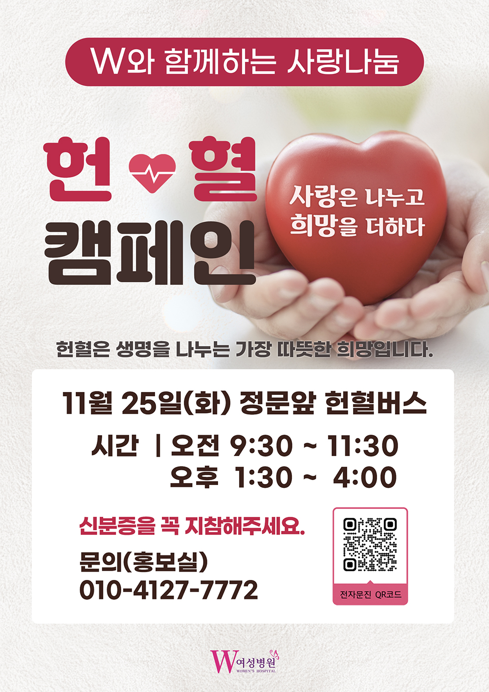 W여성병원 11월 25일(화) 사랑나눔 헌혈캠페인 진행합니다. 2025-11-03 hit.35 |