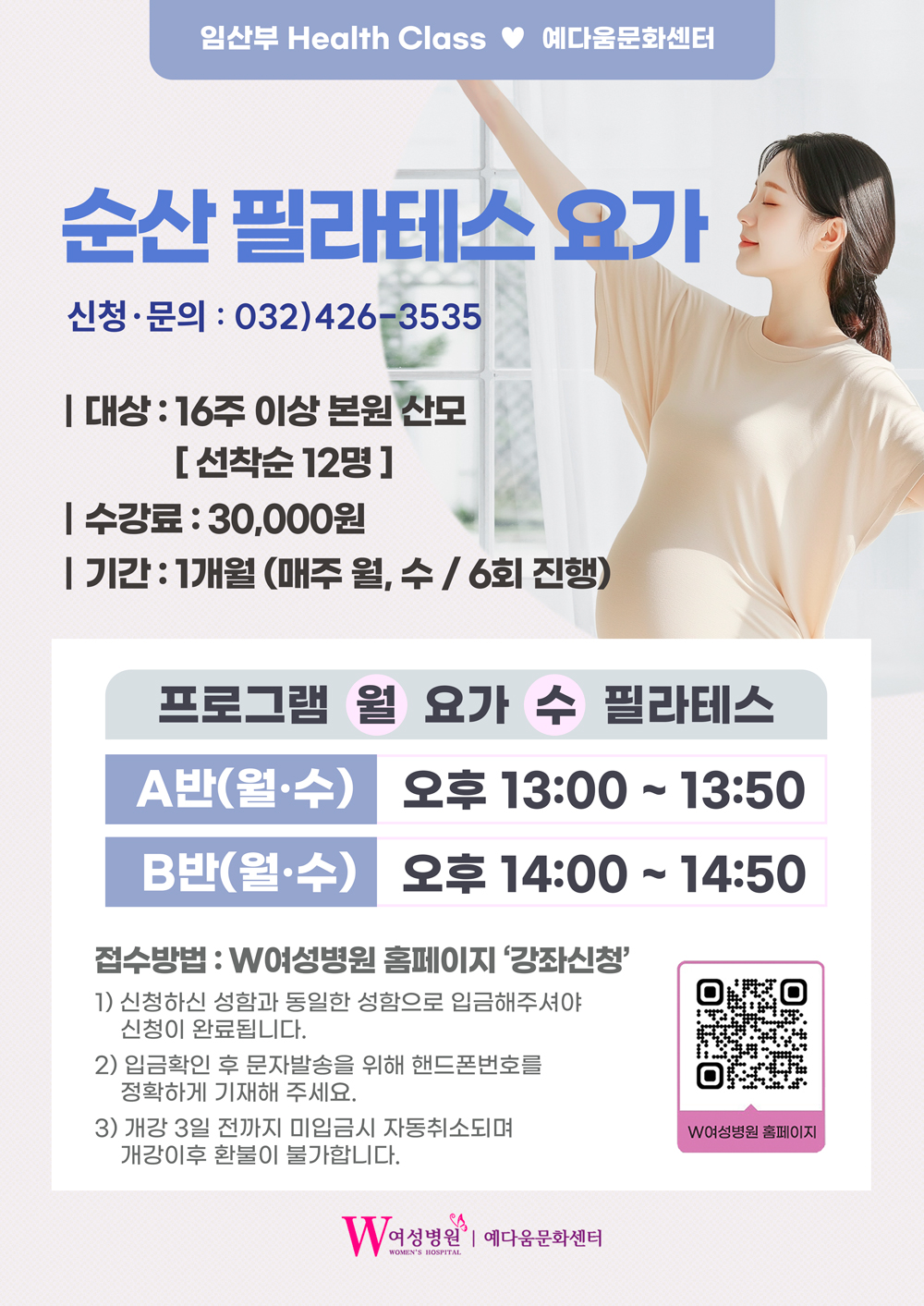 강좌내용 | ![]() 임산부 클래스 <순산 필라테스요가> ::: 일 시 ::: 1개월(월/수) A반 (월,수) 오후 13:00~13:50 [6회수강, 수강료-30,000원] B반 (월,수) 오후 14:00~14:50 [6회수강, 수강료-30,000원] ::: 대상 ::: 16주이상 본원 산모님 (선착순 12명) 임산부클래스[순산 필라테스요가] 문의 전화 T.032-426-3535 |